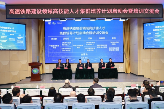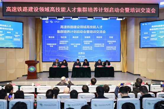 12月24日,由中铁高新工业股份有限公司、陕西铁路工程职业技术学院、中国建设教育协会联合主办的高速铁路建设领域高技能人才集群培养计划启动会暨培训交流会在陕铁院高新校区召开。中国工程院院士卢春房、王景全,中共陕西省委教育工委委员、省教育厅副厅长申雪峰,中铁工业装备集团总经理助理桑应豪,中国建设教育协会副理事长黄志良,中国铁道建筑集团有限公司首席专家任少强,中国国家铁路集团有限公司工务技术中心高级工程师吕关仁,中铁一局集团电务工程有限公司高级技师、全国双百人物、全国劳动模范窦铁成,中铁建工集团有限公司科技质量部部长吴亚东,中国教育科学研究院研究员韩倩,高等教育出版社高职事业部主任洪国芬,陕西铁路工程职业技术学院党委书记焦胜军、校长韩小卫出席会议。